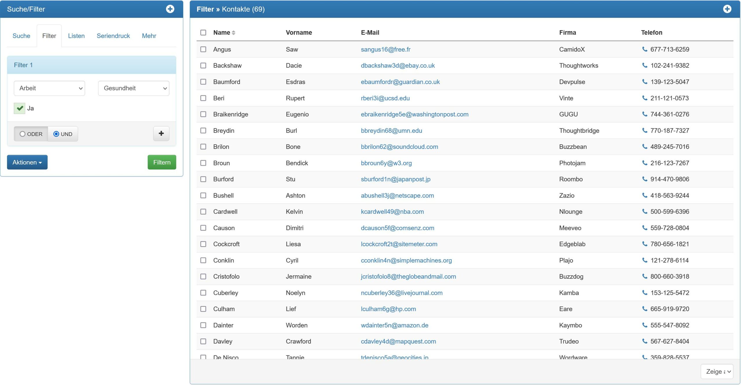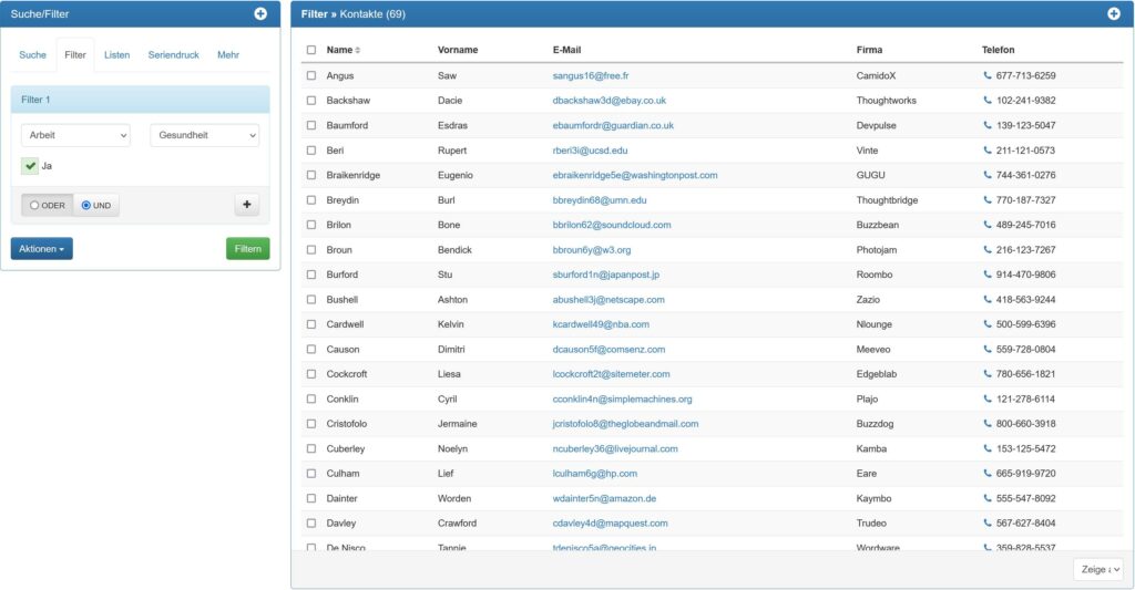 Mit dem Kontaktemodul verwalten Sie Ihre Ansprechpartner. Erfassen, pflegen und filtern Sie Kontaktdaten und erzeugen Verteiler- und Mailinglisten.
