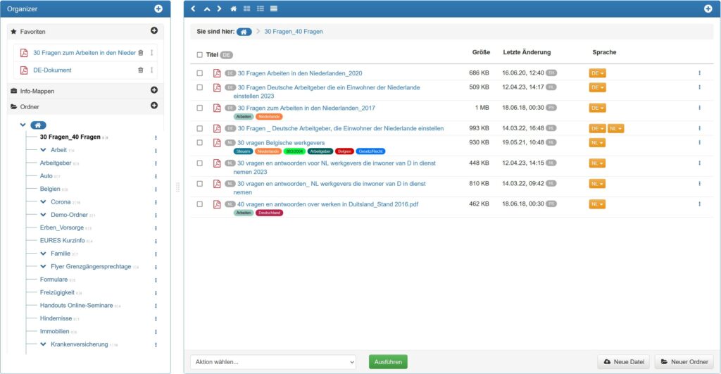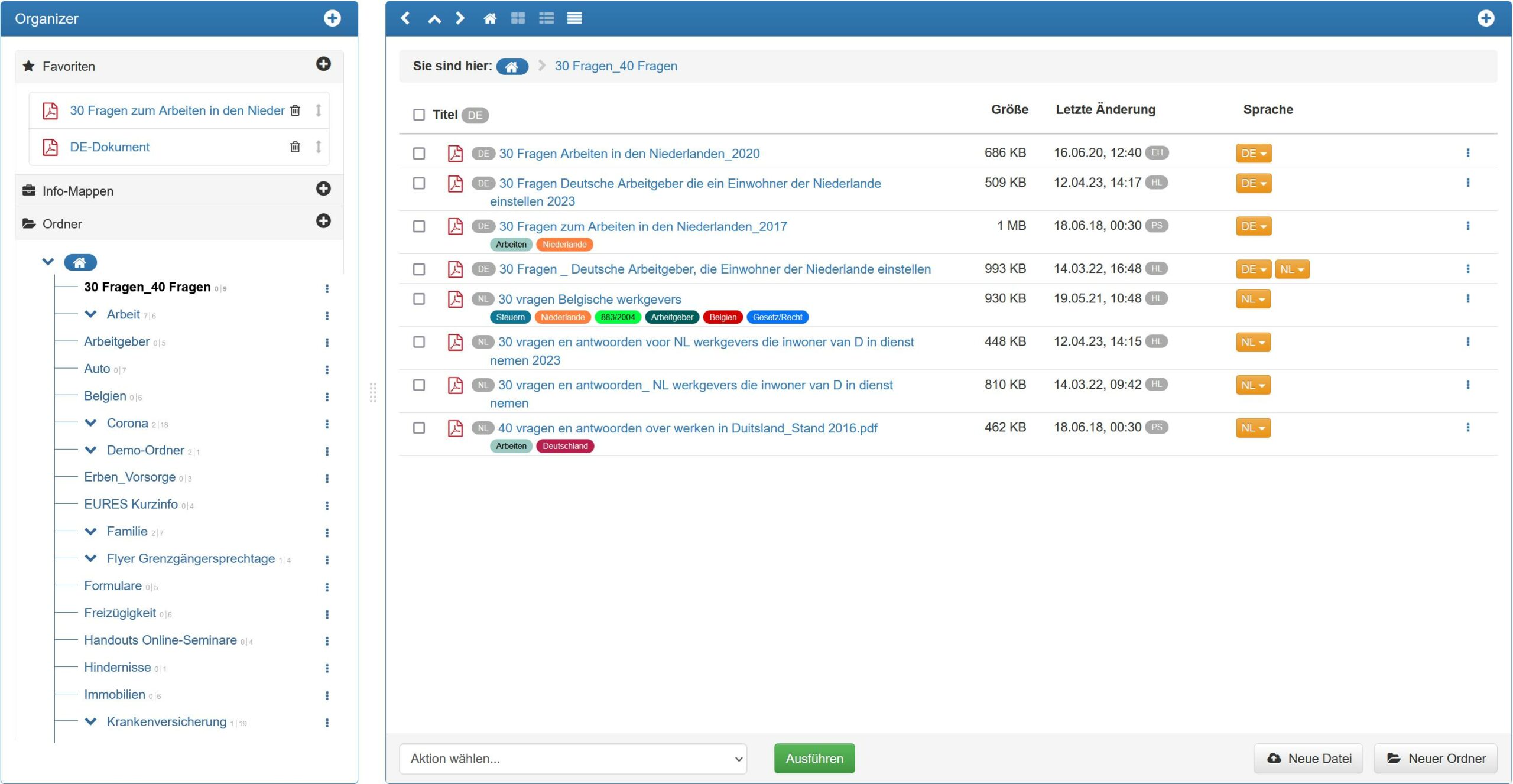 Hier verwalten Sie Ihre Dokumente, Broschüren und Flyer, die sie per Fallmanagementsystem Ihren Kunden zukommen lassen wollen. Mit Hilfe von Permalinks können sie beliebige Downloads aus dem Explorer auch auf Ihren Webseiten verwenden. Die Volltextsuche erlaubt ihnen den Downloadbestand zu durchsuchen und das mehrsprachig.