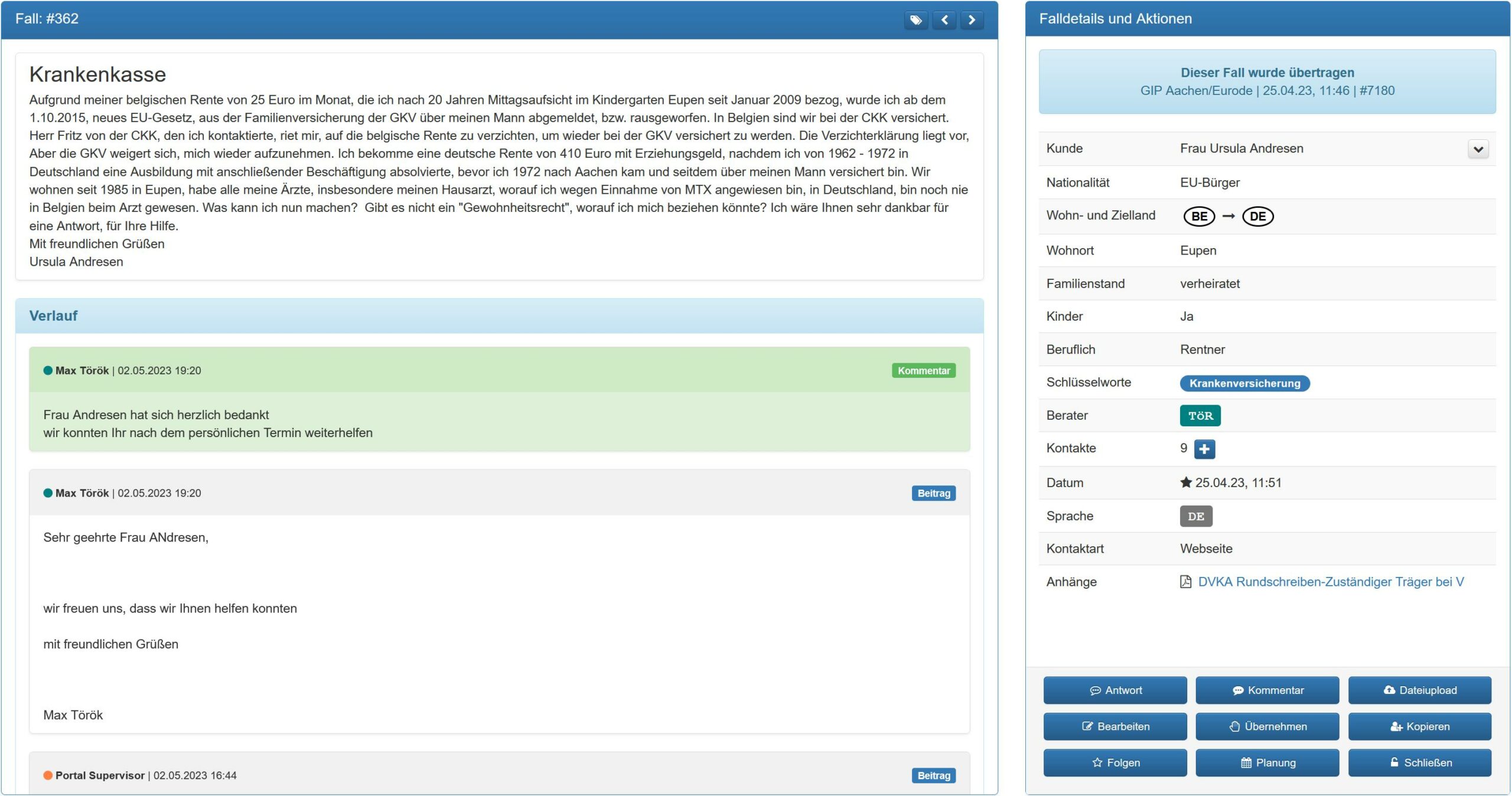 Dokumentieren Sie den kompletten Fallverlauf. Schreiben Sie Antworten und Kommentare und teilen diese mit Kunden und Beratern. Planen Sie Beratungstermine, speichern Dateianhänge und erfassen sämtliche Aspekte eines Falles.
