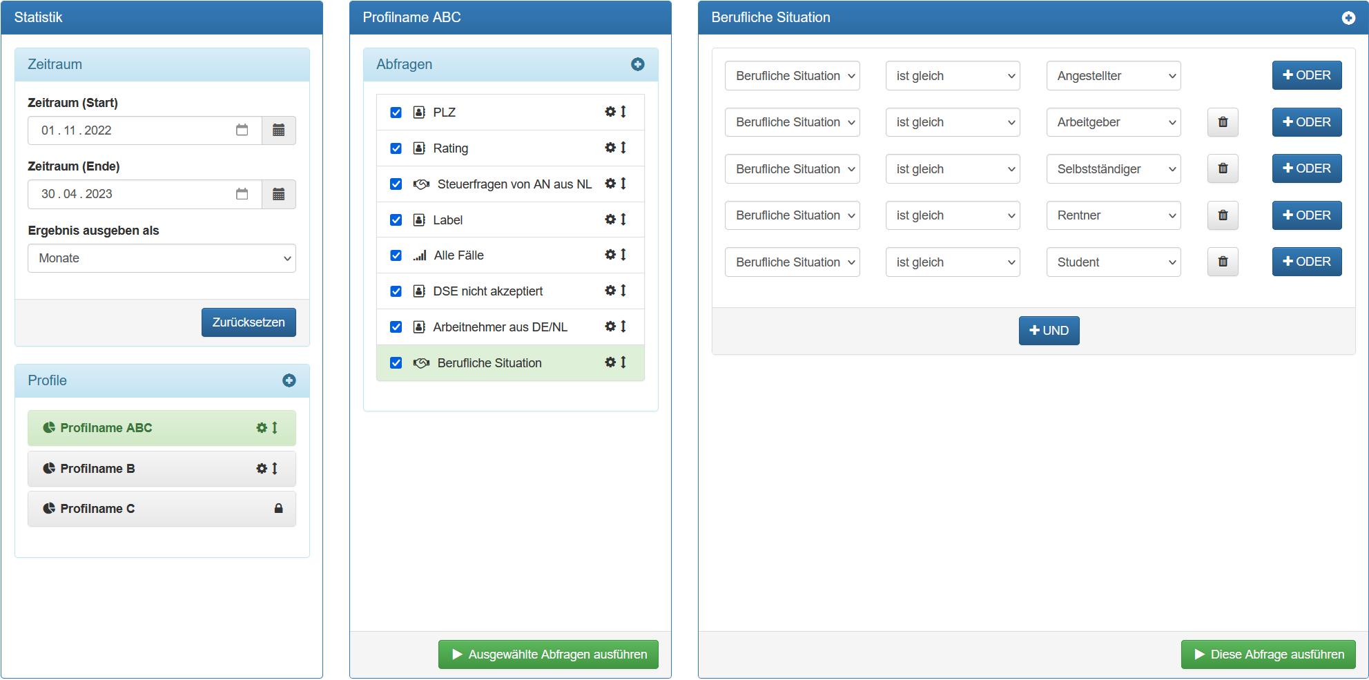 Mit dem Statistikmodul können Sie nach frei programmierten Kriterien und/oder vordefinierten Abfrageprofilen Ihre Beratungen auswerten. Sie können zum Beispiel analysieren, woher die Klienten kommen, was ihr Status ist und welche Fragen in einem von Ihnen gewählten Zeitraum häufig gestellt wurden.