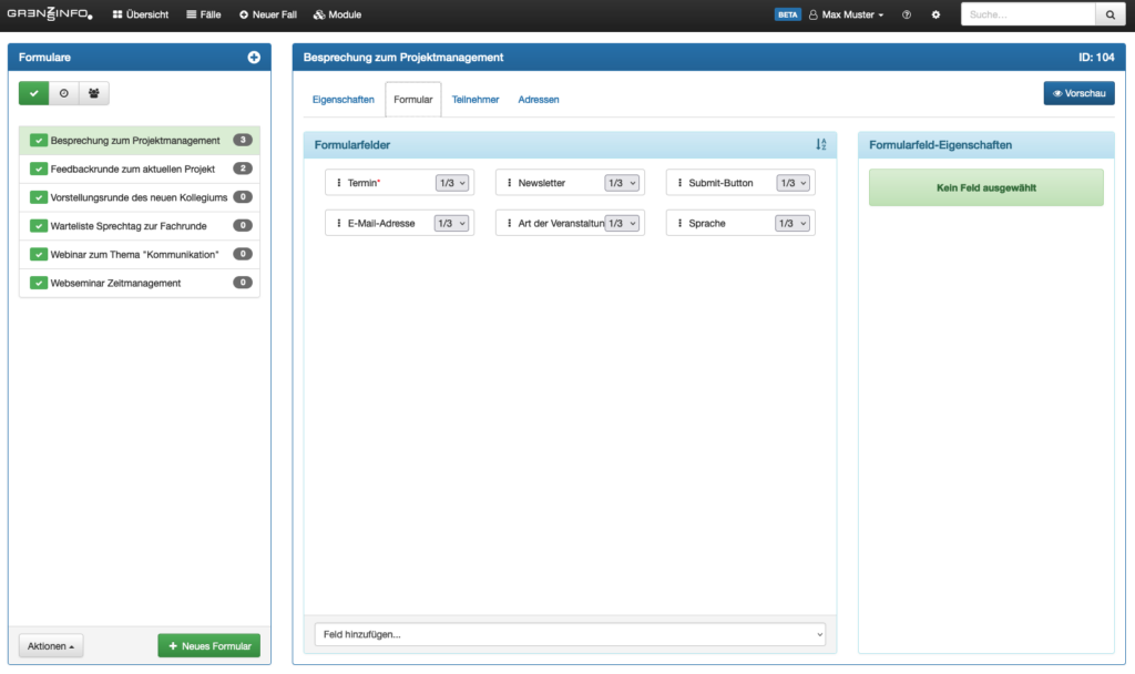Erstellen Sie Anmeldeformulare für Ihre Veranstaltungen. Erfassen Sie Teilnehmerdaten zur Weiterverarbeitung als Kontakt oder Fall. Versenden Sie Mailings und nutzen Wartelisten für ausgebuchte Events.