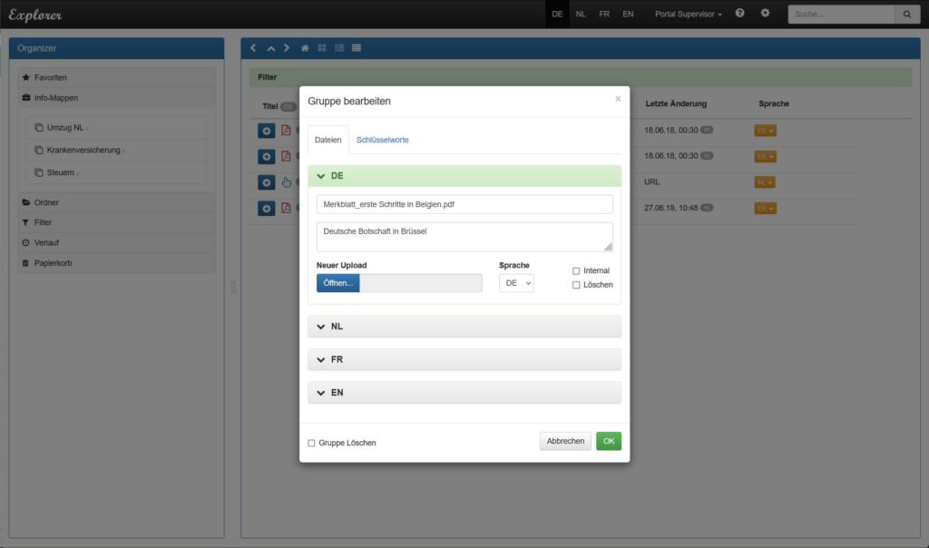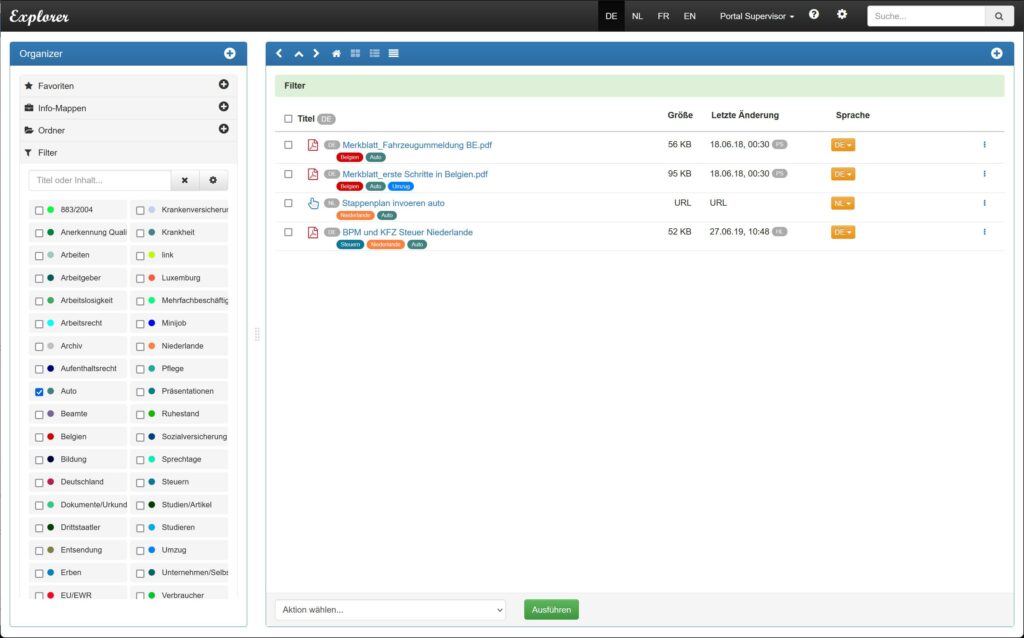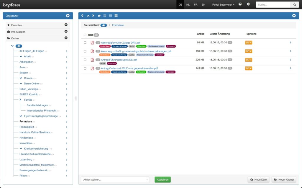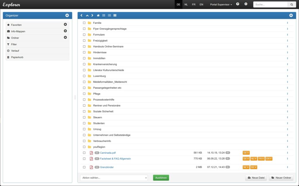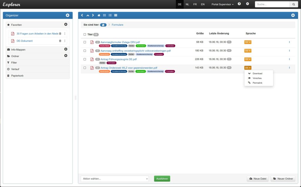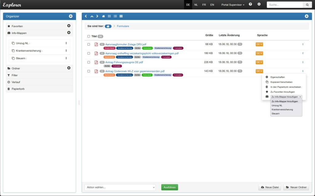Integrierte Dateiverwaltung für Dokumente, Broschüren, Flyer etc. Verwalten Sie mehrsprachige Versionen Ihres Infomaterials und stellen diese Ihren Kunden zur Verfügung.